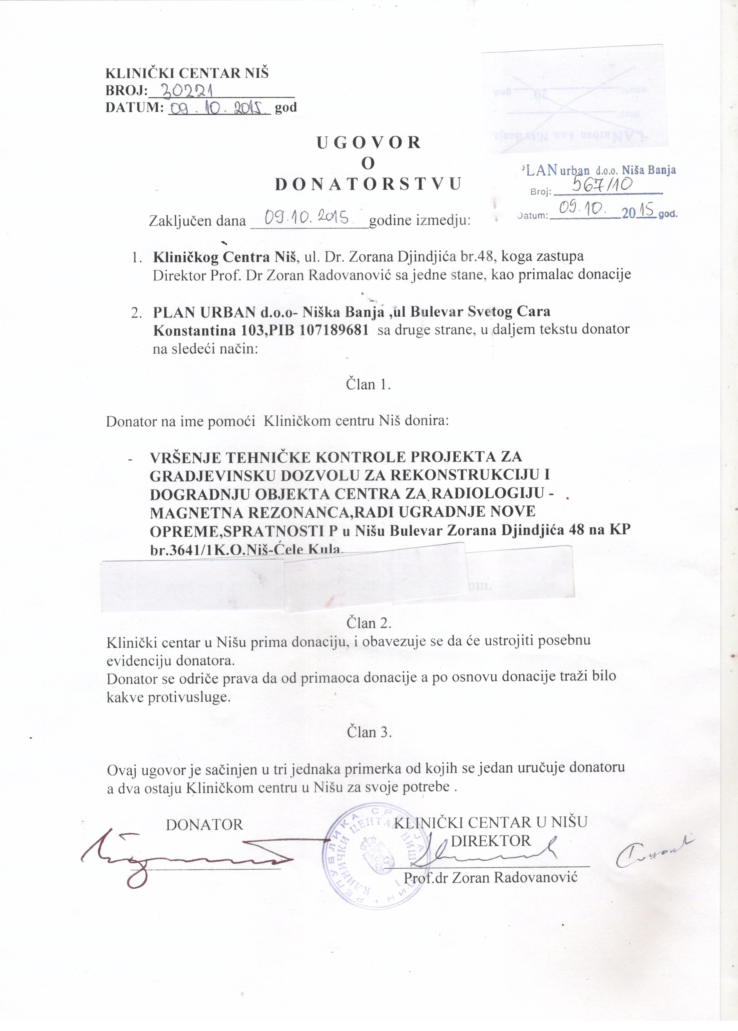 Sa ponosom i zadovoljstvom ističemo da su naša privredna društva u 2015.godini donirala:-Urbanistički projekat za izgradnju Hrama Sv.Vasilija Ostroškog u Nišu;